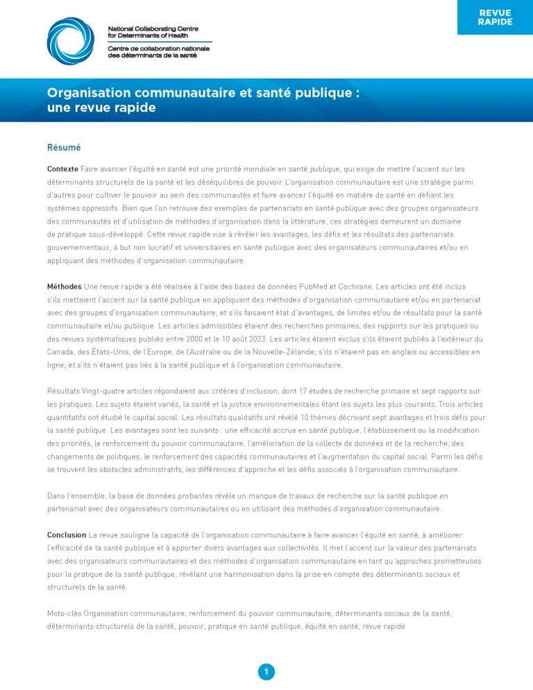L’organisation communautaire peut faire progresser l’équité en santé et agir sur les déterminants structurels et sociaux de la santé. Cette revue rapide de la littérature met en lumière les avantages, les difficultés et les résultats d’un partenariat entre la santé publique et les groupes d’organisation communautaire ou lors de la mise en application des méthodes de ces derniers.