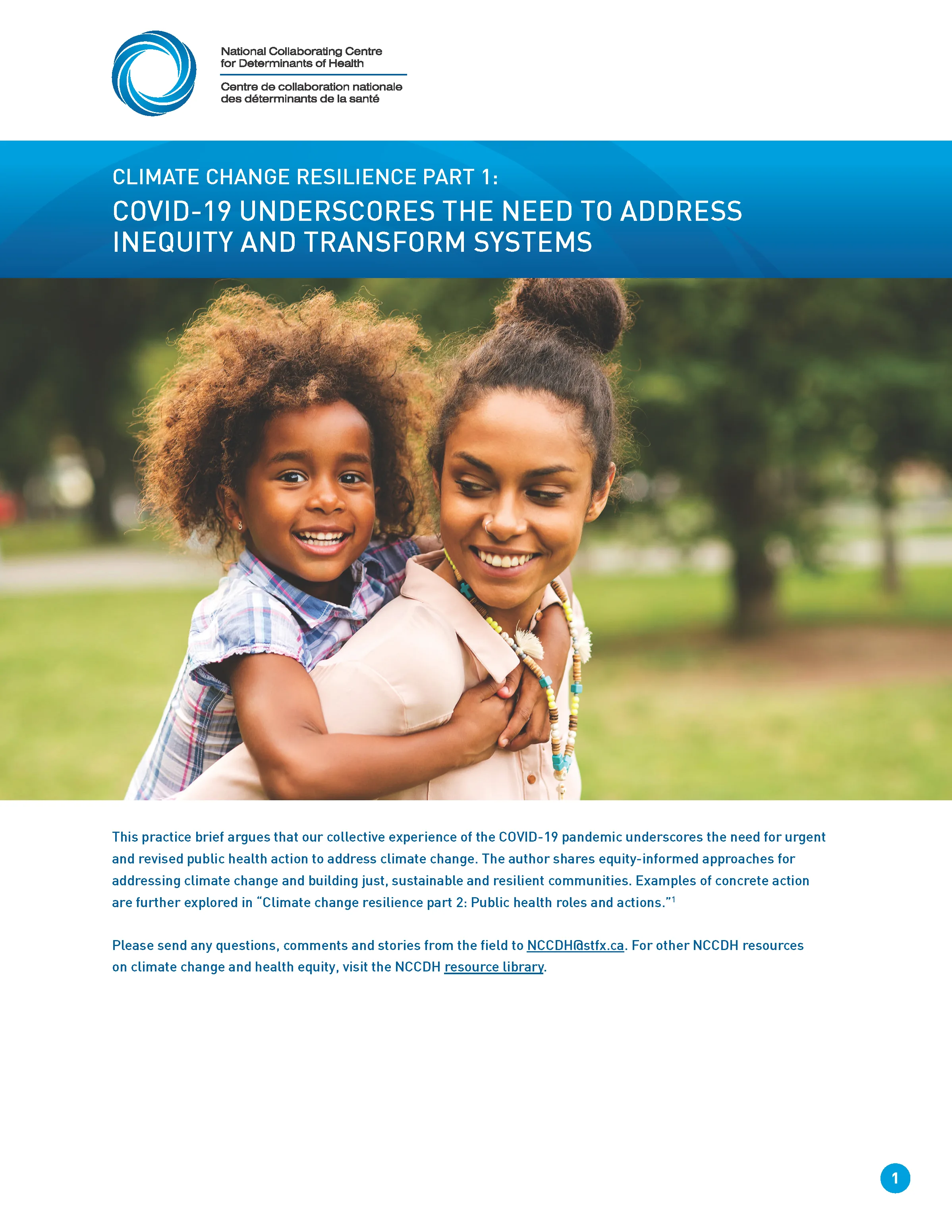 Centre de collaboration nationale des déterminants de la santé. (2021). Résilience face aux changements climatiques – deuxième partie : rôles et démarches de la santé publique. CCNDS, Université St Francis Xavier.