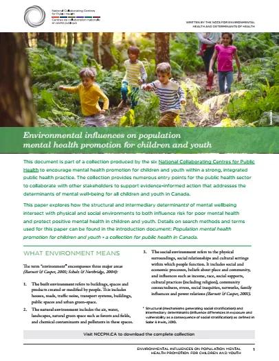 - how positive mental health in children and youth is impacted by characteristics of built and social environments;
