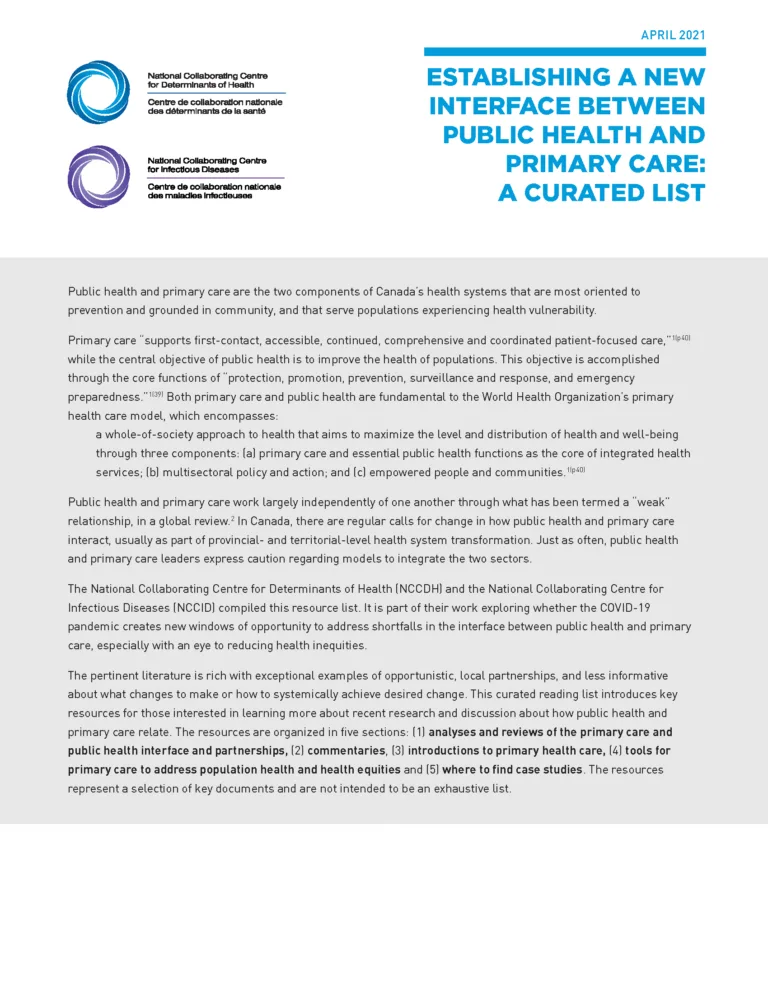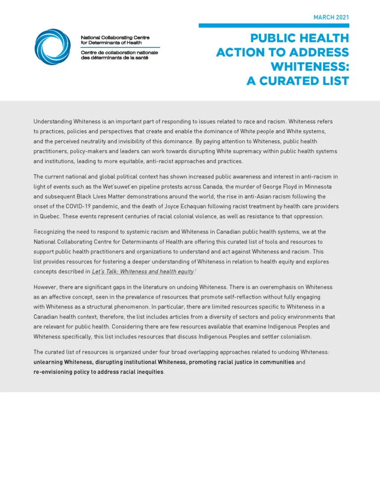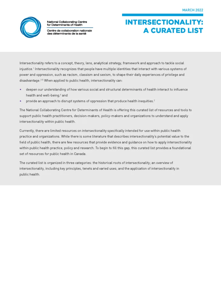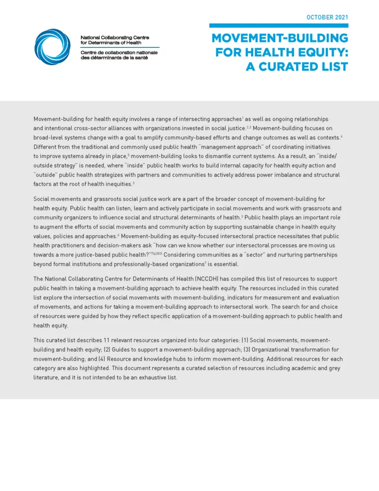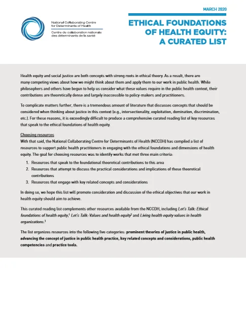 This curated resource list highlights resources that support a broad understanding of how various factors that influence health have been conceptualized. The selected documents complement the NCCDH resource Let’s Talk: Determinants of health.