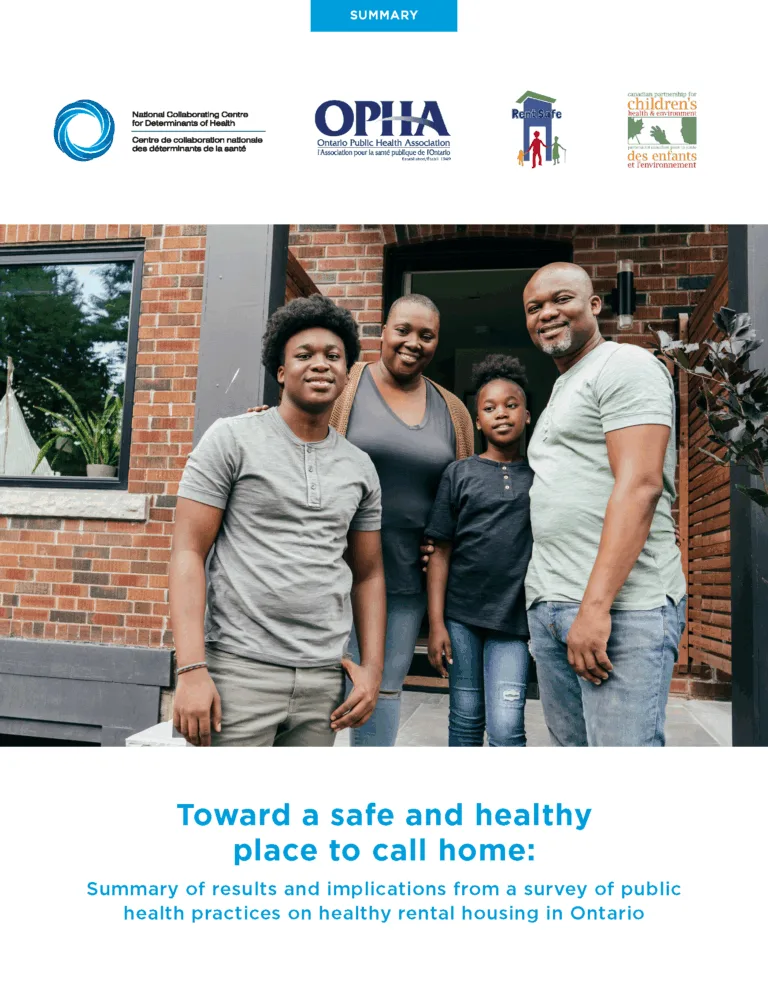 This document summarizes results from a 2023–2024 survey of Ontario public health unit practices to promote healthy housing. Highlights of survey results are presented alongside public health roles and promising practices to address inadequate and unhealthy housing conditions as a determinant of health and key driver of health inequity.